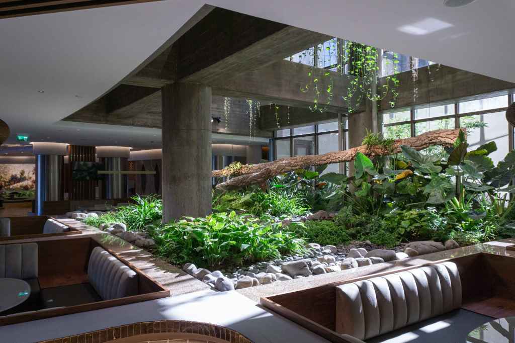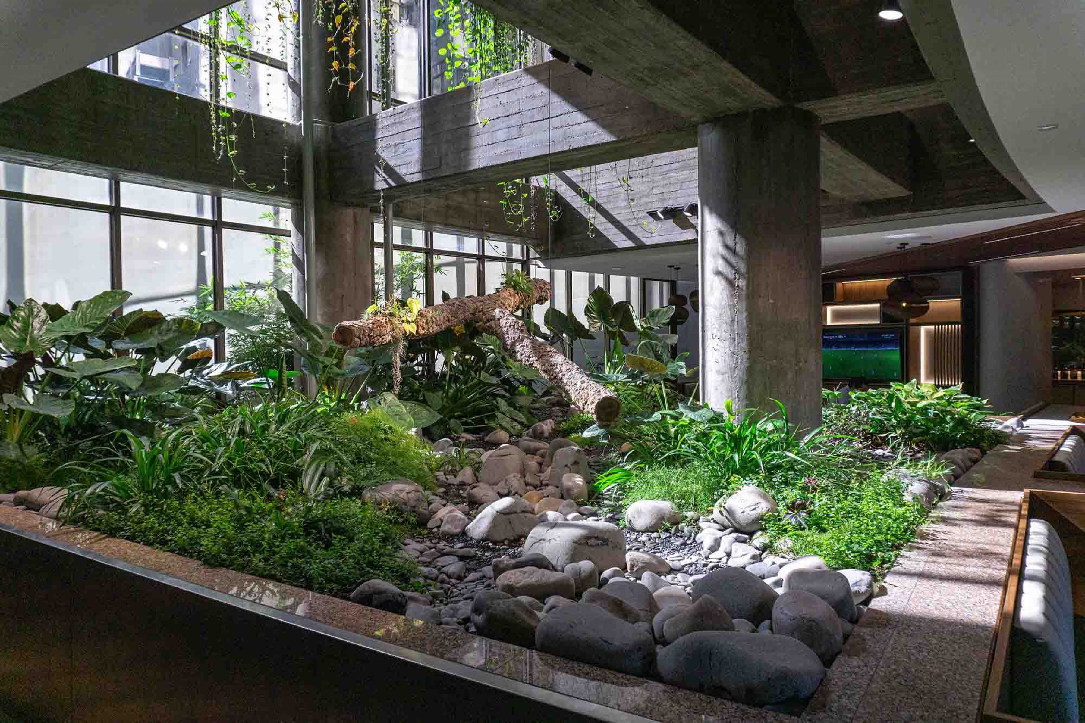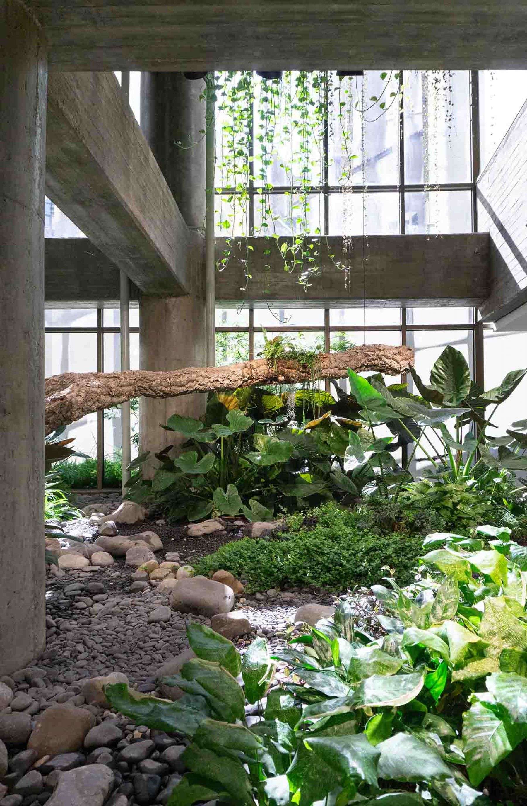The ground level consist of a mix of rocks and plants inspired by a river bed. A couple of times per day the rocks are irrigated, changing their texture and becoming a more alive element as they are slowly changing from wet to dry several times per day.