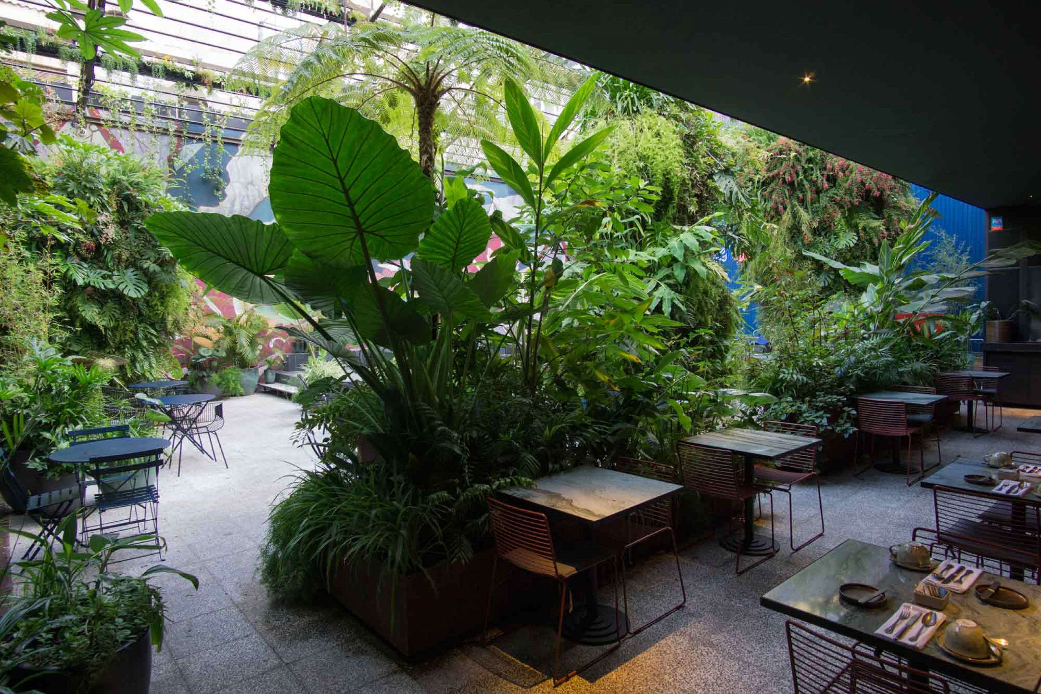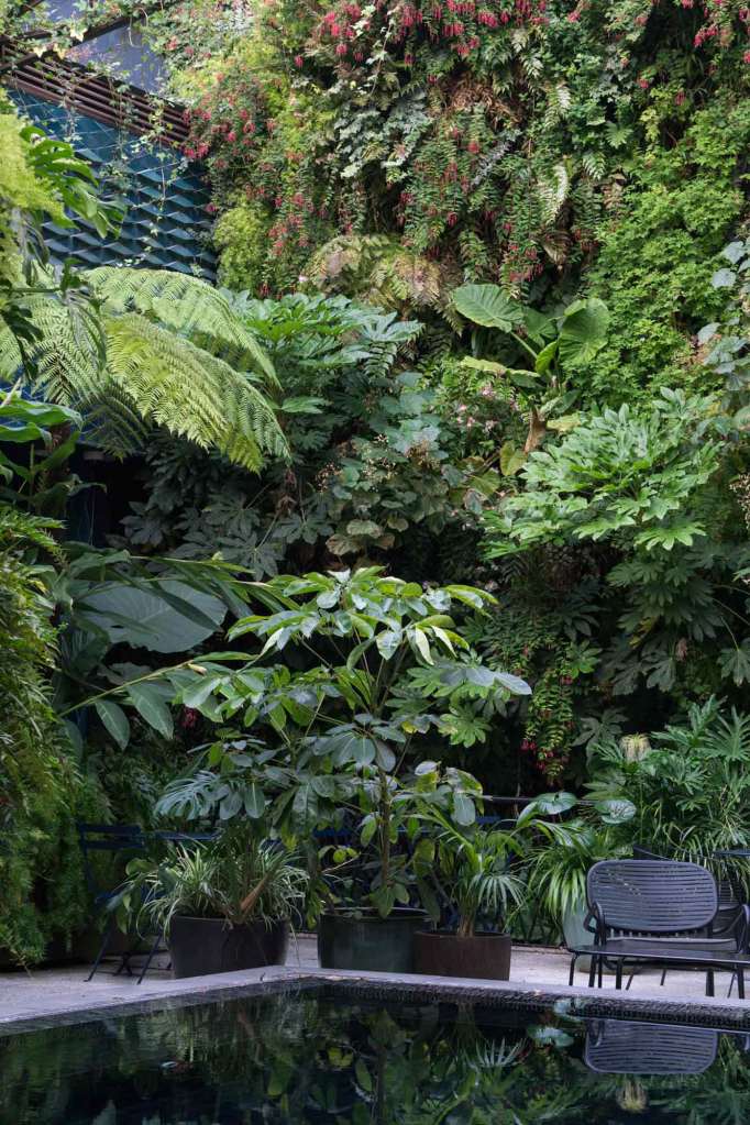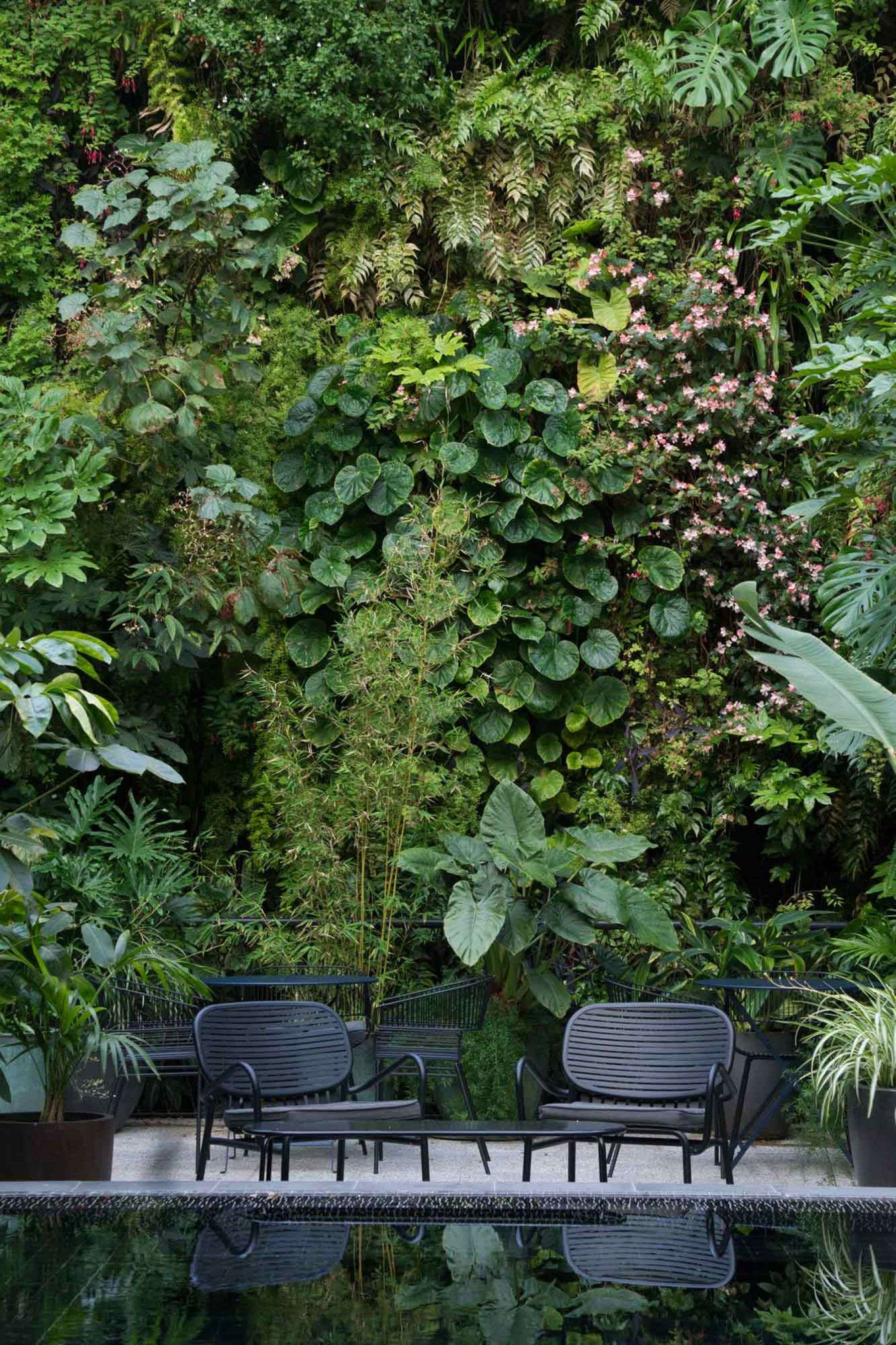 A 150m2 vertical garden with three Pinnacles and suspended plant ceiling in a exterior courtyard of a new hotel. With approximately 200 plant varieties these walls create a lush, tropical oasis in the downtown of Lisbon. The protected location allows for exotic accent plants like Begonia, Philodendron, Monstera and Alocasia. The Pinnacles acts as room dividers and allow for private seating areas surrounded by plants.